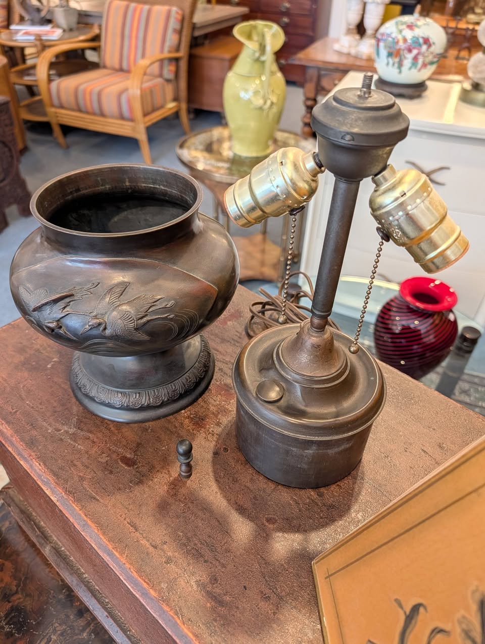 Antique Bronze Kerosene Lamp, Electrified