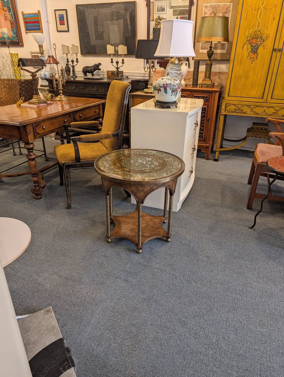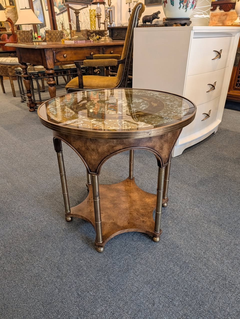 Verre Eglomise, Burl and Brass Side Table